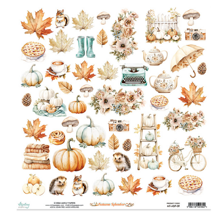 Mintay Autumn Splendor collection includes 12 sheets of double-sided printed sheets, plus a bonus sheet with elements on the back cover.