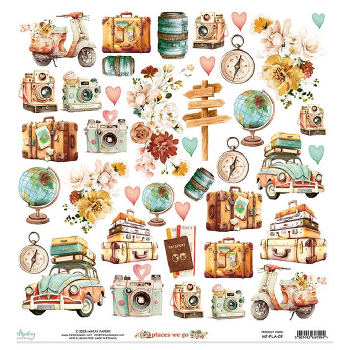 Places we go collection includes 12 sheets of double-sided printed sheets, plus a bonus sheet with elements on the back cover.